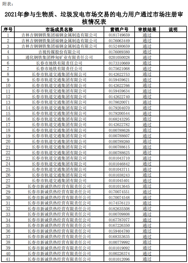 關(guān)于發(fā)布2021年參與生物質(zhì)、垃圾發(fā)電市場交易的電力用戶通過市場注冊審核情況的公告 各市場主體: 依據(jù)《吉林省能源局 吉林省發(fā)展和改革委員會 國家能 源局東北監(jiān)管局關(guān)于做好 2021 年電力市場交易工作的通知》 (吉能電力聯(lián)〔2020〕354 號)等文件精神,吉林電力交易 中心會同電網(wǎng)公司有關(guān)部門,...