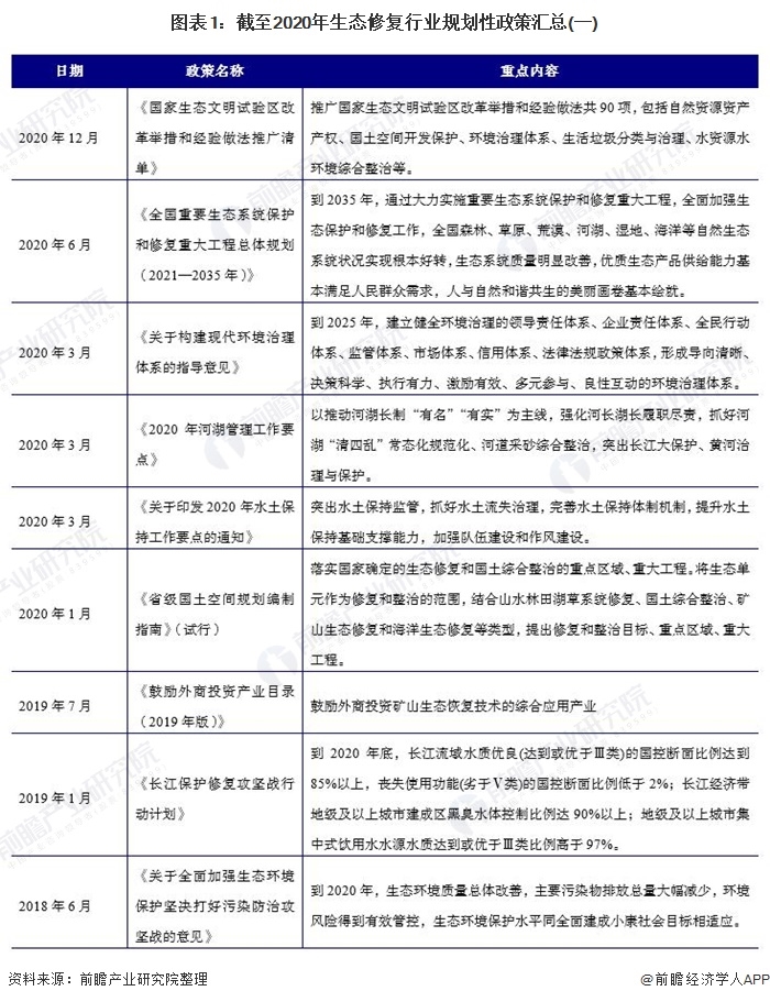 近年來,我國在生態(tài)環(huán)境修復(fù)領(lǐng)域取得了巨大成就,尤其在大氣治理和污水處理取得的成效尤為明顯,在土壤修復(fù)領(lǐng)域發(fā)展也非常迅速。這些成就離不開我國的生態(tài)修復(fù)政策制定和各省市的政策安排落實。 1、行業(yè)主要規(guī)劃性政策分析 隨著中國生態(tài)系統(tǒng)退化問題的日益凸顯,近十年來中國的生態(tài)修復(fù)事業(yè)也有了跨越式的發(fā)展,以生態(tài)文...