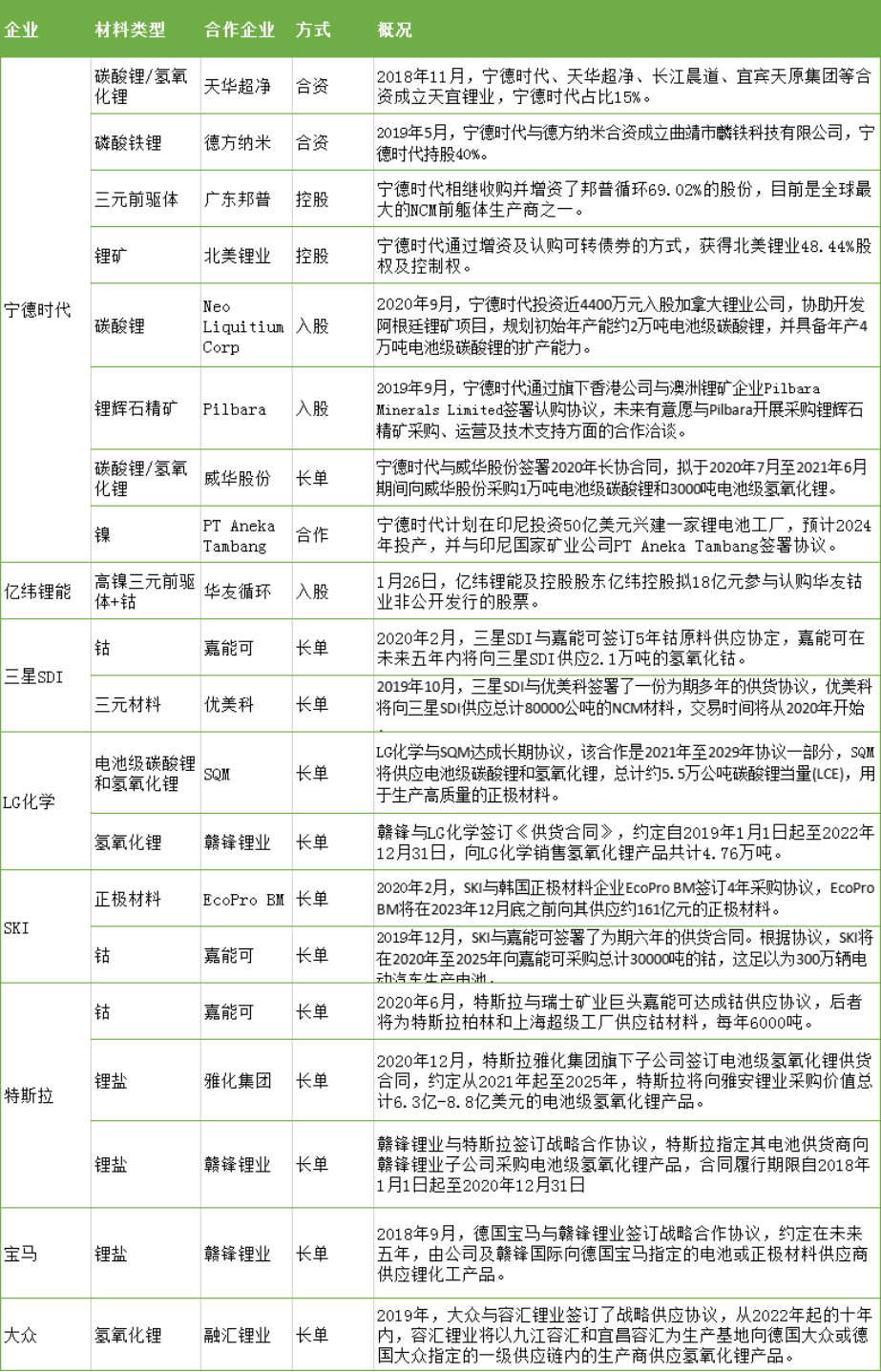 如,寧德時代2020年與威華股份簽訂電池級碳酸鋰及氫氧化鋰供應(yīng)長單,鎖定短期需求,并戰(zhàn)略入股北美鋰業(yè)、加拿大鋰業(yè),進(jìn)一步掌控長遠(yuǎn)需求;而特斯拉與嘉能可、雅化集團(tuán)、贛鋒鋰業(yè)等簽署采購協(xié)議,保障鋰鹽供應(yīng),并進(jìn)一步提升其電池議價權(quán)。