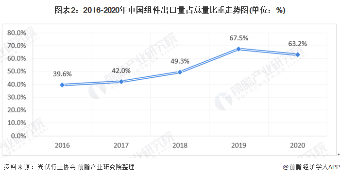 我國(guó)組件出口量在國(guó)內(nèi)產(chǎn)量中的占比依然保持高位,2020年比重為63.2%