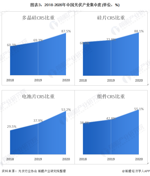 2018-2020年期間我國(guó)多晶硅CR5集中度從60.3%增至87.5%;硅片CR5集中度從68.6%增至88.1%;電池片CR5集中度從29.5%增至53.2%;組件CR5集中度從38.4%增至55.1%。