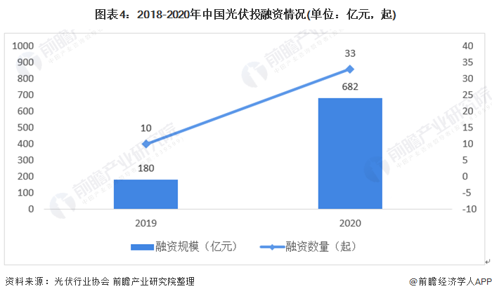 2020年我國(guó)光伏行業(yè)投融資金額為682億元,同比增長(zhǎng)279%;融資事件數(shù)為33起,同比增長(zhǎng)230%。