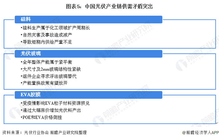 我國(guó)光伏產(chǎn)業(yè)鏈供需矛盾突出,硅料生產(chǎn)屬于化工領(lǐng)域擴(kuò)產(chǎn)周期長(zhǎng),自然災(zāi)害及事故造成減產(chǎn),導(dǎo)致短期內(nèi)供給嚴(yán)重不足;光伏玻璃全年整體產(chǎn)能屬于緊平衡,大尺寸及2mm玻璃結(jié)構(gòu)性緊缺;受疫情影響EVA粒子材料資源擠兌,POE和EVA價(jià)格倒掛。