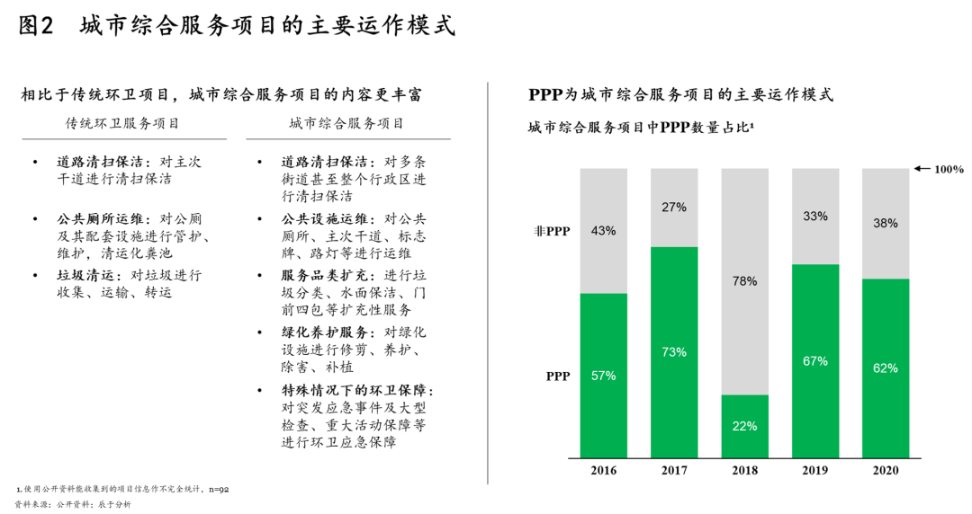 其二,PPP模式的采用,利用社會資本解決環(huán)衛(wèi)一體化項目的資金難題成為可能。相比于傳統(tǒng)環(huán)衛(wèi)項目,城市綜合服務(wù)項目的內(nèi)容更為豐富,對資金的要求也相應(yīng)提升,PPP模式的應(yīng)用為有效盤活現(xiàn)有環(huán)衛(wèi)資產(chǎn)提供思路,其也成為城市綜合服務(wù)項目的主要運(yùn)作模式,催生新一批的環(huán)衛(wèi)大單(如圖2)。