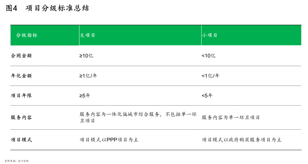 基于已有項目數(shù)據(jù),辰于從合同金額、年化金額、項目年限、服務(wù)內(nèi)容、項目模式這五個分級標(biāo)準(zhǔn)對“大項目”進(jìn)行界定區(qū)分(如圖4)。一般而言,滿足以下條件之一的環(huán)衛(wèi)項目即可稱為“大項目”:合同金額在10億以上;年化金額在1億以上;合作年限在5年以上。