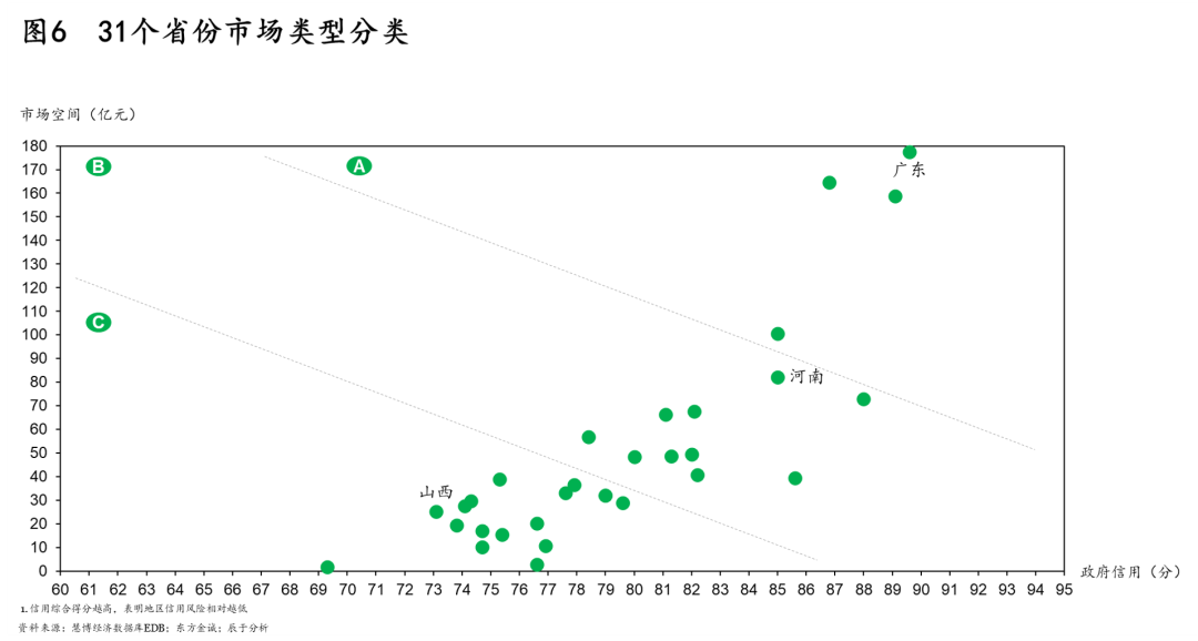 環(huán)衛(wèi)大單的產(chǎn)生不僅需要足夠的市場空間,而且需要當(dāng)?shù)卣休^強(qiáng)的財政支付能力,辰于采用市場空間和政府信用雙維度分析,建立以環(huán)衛(wèi)大單為目標(biāo)的區(qū)域評估模型(如圖6)。其中,東部省份(如廣東等)市場空間大,足以孕育出足夠的大金額項目,且政府信用相對較好,財政支付能力強(qiáng),債務(wù)風(fēng)險低。關(guān)注大單的企業(yè)可以在該類地區(qū)多拿項目,并與政府保持密切的溝通和聯(lián)系,通過集群效應(yīng)、中心輻射效應(yīng),與政府合力催生出大項目。