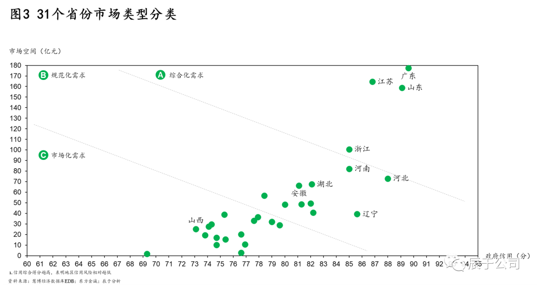 根據(jù)31個省、自治區(qū)、直轄市的市場空間和政府信用的雙維度得分結(jié)果,我們將這些區(qū)域按需求層次劃分為市場化需求、規(guī)范化需求、綜合化需求三類。其中,處在綜合化需求階段的區(qū)域最值得企業(yè)關(guān)注,其市場化空間大,同時政府信用相對較好,財政支付能力強,債務(wù)風(fēng)險低,在綜合性、前瞻性的需求之下,極有可能孕育出大金額、長周期的環(huán)衛(wèi)項目;處在規(guī)范化需求階段的區(qū)域市場化空間中等,同時政府信用中等,有一定債務(wù)風(fēng)險,由于該類地區(qū)有市場化試點、逐步形成一體化管理的趨勢,產(chǎn)生周期較長的環(huán)衛(wèi)項目的可能性較大,也有值得環(huán)衛(wèi)企業(yè)關(guān)注的優(yōu)質(zhì)項目;處在市場化需求階段的區(qū)域市場化空間相對較小,同時政府信用相對較低,債務(wù)風(fēng)險高,大概率會產(chǎn)生碎片化的簡單項目,企業(yè)應(yīng)探索創(chuàng)新的運營模式,協(xié)助政府加速推進(jìn)環(huán)衛(wèi)市場化建設(shè)。