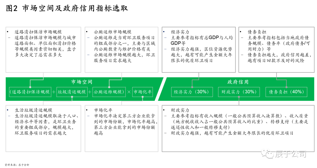 對于市場空間指標(biāo),我們將道路清掃保潔規(guī)模、公廁運營市場規(guī)模、生活垃圾清運規(guī)模進(jìn)行加總后乘以市場化率,得到各區(qū)域的環(huán)衛(wèi)市場空間。對于政府信用指標(biāo),我們分別賦予政府經(jīng)濟實力、財政實力和債務(wù)負(fù)擔(dān)以30%、30%和40%的權(quán)重,得到各區(qū)域的綜合評分。