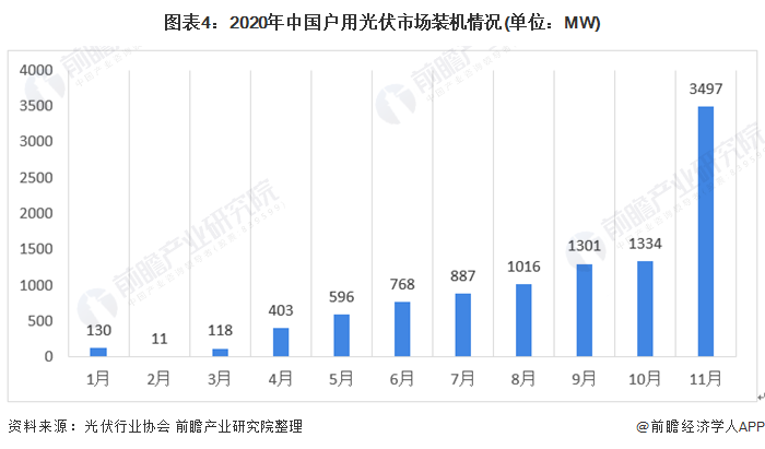 2020年1-11月我國(guó)戶用光伏市場(chǎng)裝機(jī)量總體呈逐月增長(zhǎng)態(tài)勢(shì),裝機(jī)容量集中在Q4。2020年11月我國(guó)戶用光伏市場(chǎng)裝機(jī)量為3497MW,遠(yuǎn)高于其他月份。