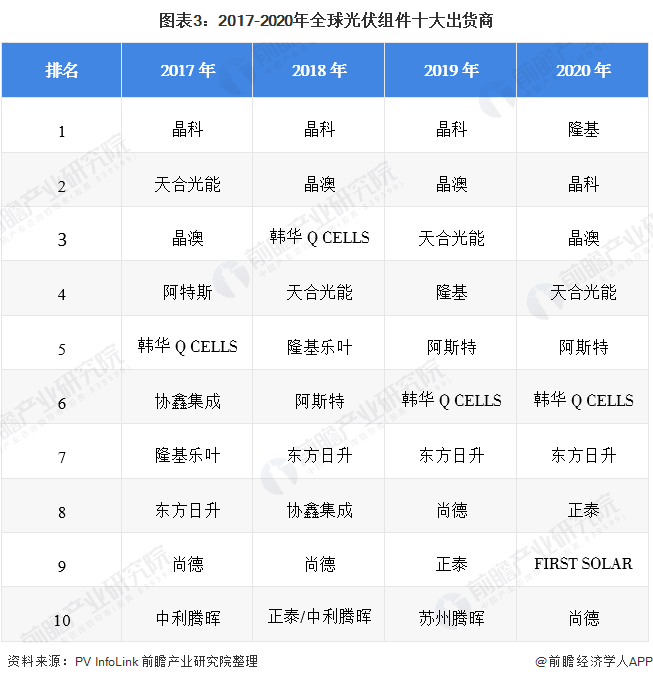 在全球市場(chǎng)上,我國(guó)光伏行業(yè)在組件環(huán)節(jié)的優(yōu)勢(shì)較大,根據(jù)PV InfoLink對(duì)全球十大組件出貨商的統(tǒng)計(jì),2017-2020年以來(lái),國(guó)內(nèi)組件廠商在全球的競(jìng)爭(zhēng)對(duì)手僅有美國(guó)的First Soler,韓國(guó)的韓華集團(tuán)。