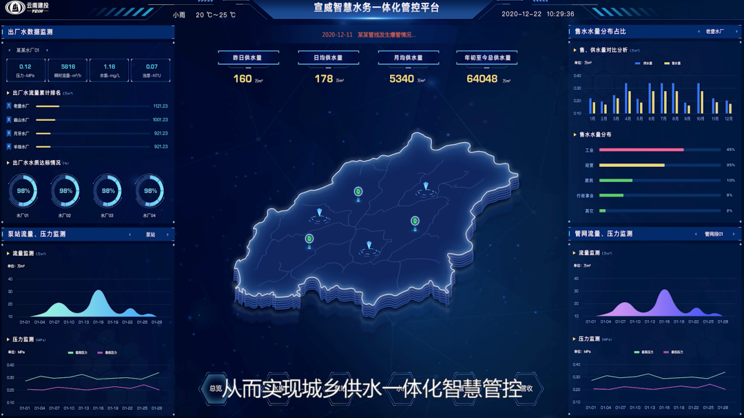 宣威智慧水務一體化平臺運用GIS+BIM、監(jiān)控感知、數(shù)字化企業(yè)管理技術,達到了標準化、精細化、可視化施工管理,實現(xiàn)了投融資、建設管理、運營管理一體化發(fā)展;打破了過去城鄉(xiāng)之間、城區(qū)之間、部門之間“九龍治水”的格局,消除了水資源管理壁壘,實現(xiàn)了從城市到鄉(xiāng)鎮(zhèn)、從水源到水龍頭的一體化、數(shù)字化、智慧化管控;通過整合云計算、大數(shù)據(jù)、物聯(lián)網(wǎng)技術,打造宣威市數(shù)字水務一體化平臺,實現(xiàn)了水庫、泵站、水廠、管網(wǎng)集中運維和客戶服務、商業(yè)營收、移動終端全水務業(yè)務集中管理,并有機整合涉水部門職責、及時分析處理涉水信息,實現(xiàn)數(shù)據(jù)共享和交換,形成全市水務物聯(lián)網(wǎng),為數(shù)字城市建設奠定了基礎。