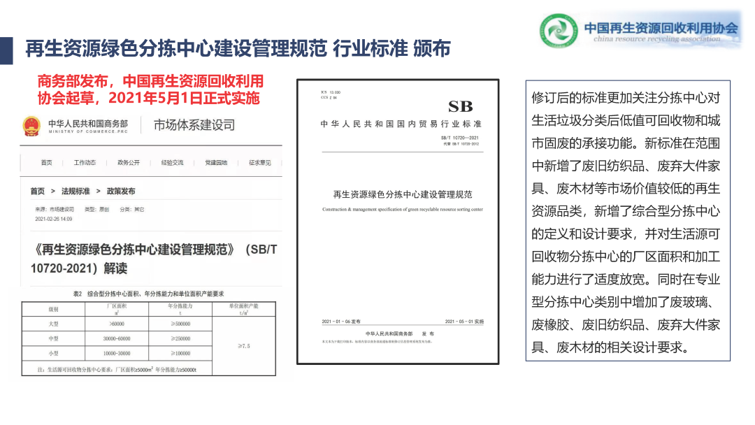 我們特意強(qiáng)調(diào)了一下,修了三年,這個(gè)標(biāo)準(zhǔn)今年終于發(fā)布了。一出來(lái)社會(huì)反響特別大,關(guān)注分揀中心的合規(guī)性,一定要讓規(guī)范的企業(yè)沖到市場(chǎng)主體,去承擔(dān)相應(yīng)的體系建設(shè)的任務(wù),所以酒吧相應(yīng)的標(biāo)準(zhǔn)強(qiáng)調(diào)了,也增加了生活源分類(lèi)后回收物去承接的功能。就是把再生資源分揀中心完全打造成服務(wù)于城市固廢服務(wù)一個(gè)重要的節(jié)點(diǎn),這是一個(gè)很重要的標(biāo)準(zhǔn),也是我們做了三年的一個(gè)結(jié)果。