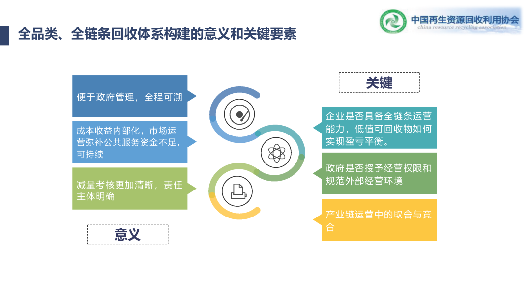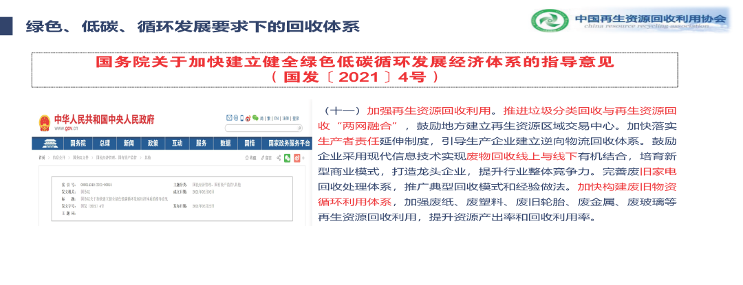 剩下幾個(gè),一個(gè)就是生產(chǎn)者責(zé)任延伸,一個(gè)就是家電,還有回收的模式,線(xiàn)上線(xiàn)下結(jié)合,包括加強(qiáng)循環(huán)利用,我讀了十一條之后,都點(diǎn)到了,我個(gè)人理解它是從體系建設(shè)來(lái)抓,每句話(huà)說(shuō)的都是怎么樣健全完善資源回收的體系,從體系的角度去講的,而不是前幾年打造基地,打造園區(qū),打造回收站點(diǎn),現(xiàn)在是說(shuō)從體系建設(shè)上來(lái)提高它的資源回收利用率。