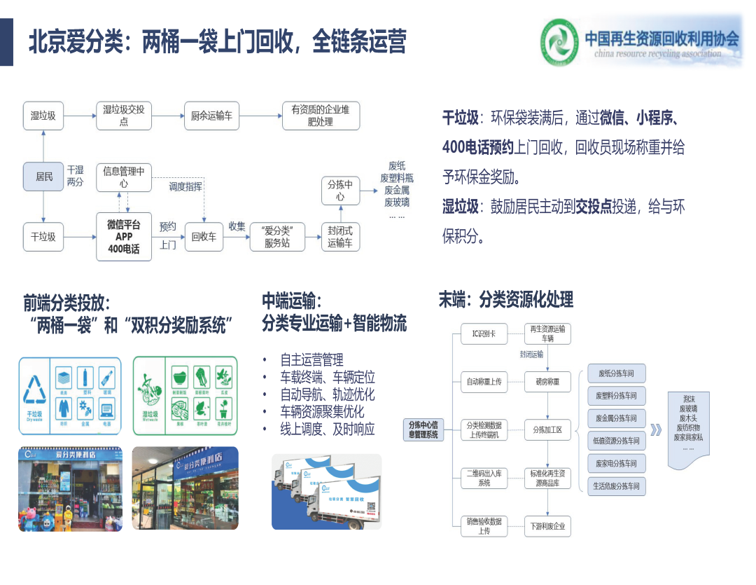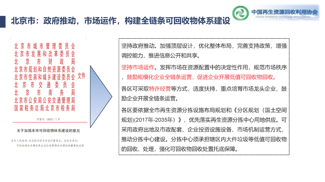 后面想跟大家分享的就是各地方政府在推動(dòng)全鏈條回收體系建設(shè)的一些舉措,我們最熟悉北京,我們跟蹤北京跟蹤了四五年的服務(wù)。北京市今年了一號(hào)文,題目就是加強(qiáng)本市可回收物體系建設(shè)的意見(jiàn),我們張主任特別清楚,天天市里面都在想辦法貫徹這個(gè)文件,抓各區(qū)的體系建設(shè)。