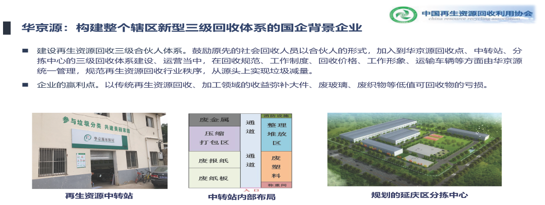 在北京有兩家企業(yè)很有名,就是行業(yè)內(nèi)的,現(xiàn)在在做整個(gè)體系的,一個(gè)是華京源,也是我的一個(gè)兄弟單位,中國(guó)再生資源公司下屬的子公司,他傳統(tǒng)就是做末端分揀中心經(jīng)營(yíng)的,這四五年在前端做?,F(xiàn)在在北京延慶區(qū)、通州區(qū)、豐臺(tái)區(qū)包括西城一部分都是華京源在做主體企業(yè),建立了三級(jí)回收體系。從它社區(qū)的分類(lèi)驛站開(kāi)始布,然后到中轉(zhuǎn)站,到末端的分揀中心,全鏈條的在運(yùn)營(yíng),而且高值低值都收。就是我們剛才說(shuō)的這種模式,但是華京源面臨很多問(wèn)題,企業(yè)已經(jīng)提前支付了太多的成本。