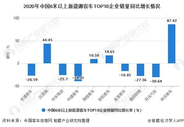 從銷量前10企業(yè)的銷售增長情況來看,2020年1-12月份,在新能源客車行業(yè)市場(chǎng)整體銷量大幅縮減背景下,僅有比亞迪、海格客車、安凱客車和申沃客車四家企業(yè)實(shí)現(xiàn)正增長,其中比亞迪增長率達(dá)到44.45%,逆勢(shì)增長的勢(shì)頭迅猛。