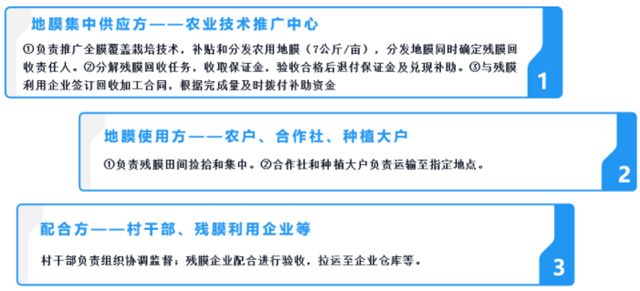 該模式中,主要涉及三方:地膜集中供應(yīng)方——農(nóng)業(yè)技術(shù)推廣中心;地膜使用方——農(nóng)戶、合作社、種植大戶;配合方——村干部、殘膜利用企業(yè)等。具體責(zé)任分工如下: