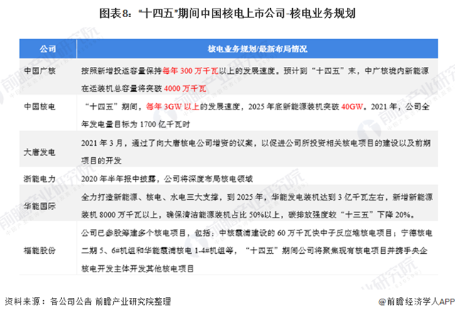 根據(jù)“十四五規(guī)劃和2035年愿景目標綱要”,“十四五”期間,我國核電運行裝機容量達到7000萬千瓦。據(jù)此,核電行業(yè)的中國廣核、中國核電也相應提出了其十四五發(fā)展目標,中國廣核表示將保持每年300萬千瓦以上發(fā)展速度,中國核電表示每年將保持3GW以上的發(fā)展速度。此外,核電企業(yè)的其他上市公司也明確了其核電業(yè)務的發(fā)展布局: