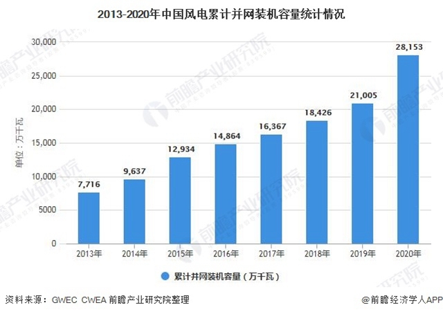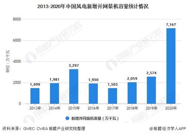 風(fēng)電裝機(jī)容量逐年增長(zhǎng)。據(jù)統(tǒng)計(jì),2019年我國(guó)風(fēng)電裝機(jī)容量達(dá)到了21005萬(wàn)千瓦。截止2020年底中國(guó)風(fēng)電累計(jì)裝機(jī)容量達(dá)到28153萬(wàn)千瓦,累計(jì)增長(zhǎng)34.6%,其中新增風(fēng)電并網(wǎng)裝機(jī)容量7167萬(wàn)千瓦,同比大增178%。