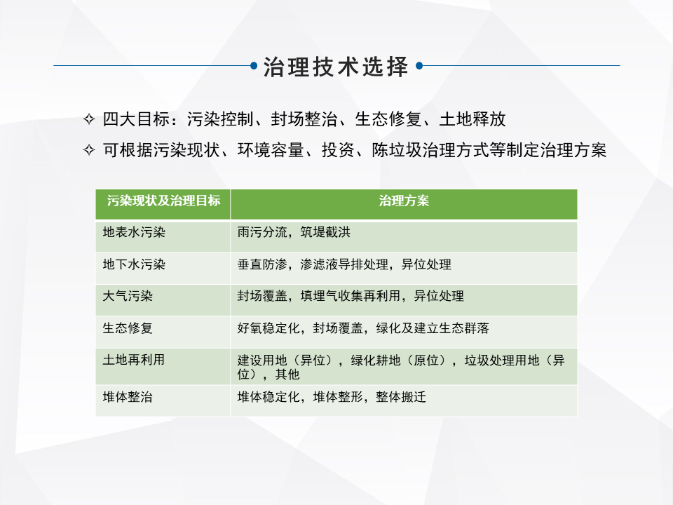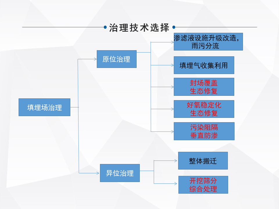 處理的技術(shù)涵蓋的面,整個(gè)行業(yè)涵蓋的面還是比較多的,大的來分,有原位的治理和異位的治理。原味的治理,像衛(wèi)生填埋場和簡易填埋場需要做一些現(xiàn)有的配套設(shè)施的升級,雨污分流,怎么樣能去有效的減少持續(xù)的像滲濾液產(chǎn)生。填埋氣的收集利用,還有有的是直接封廠覆蓋,做生態(tài)修復(fù),還有做一個(gè)加速的酶化以后,再做生態(tài)修復(fù)。還有早期的簡易填埋,甚至沒有做防滲的,在現(xiàn)有不具備整體搬遷的條件下,去做一些污染阻隔。