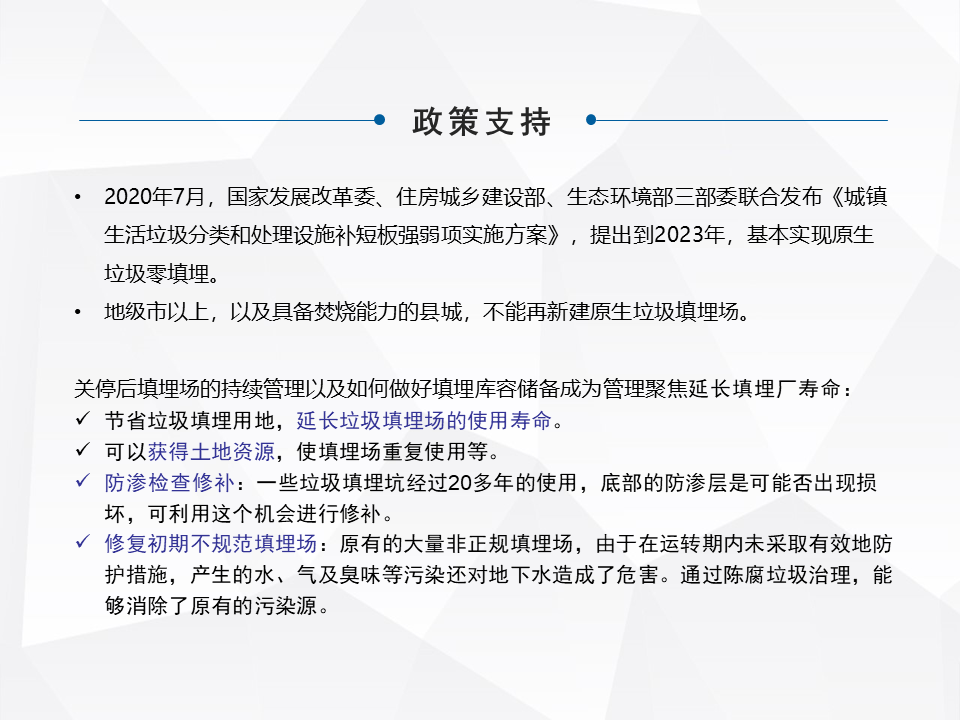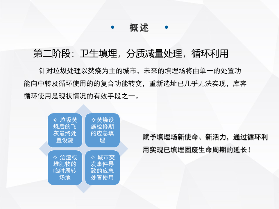 第二個(gè)階段,“十二五”、“十三五”主要針對非正規(guī)填埋場的治理,到“十四五”或者未來的十年,目前已經(jīng)開始關(guān)注新的填埋場由單一的處理功能向中轉(zhuǎn)和循環(huán)使用的復(fù)合功能區(qū)轉(zhuǎn)變,很多都是對填埋場的場地有再利用的需求,或者對庫容有循環(huán)利用的需求。近幾年,特別是北上廣深這些土地比較緊缺的,人口比較密集的城市,最早開始關(guān)注到這個(gè)行業(yè)。