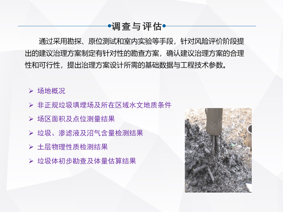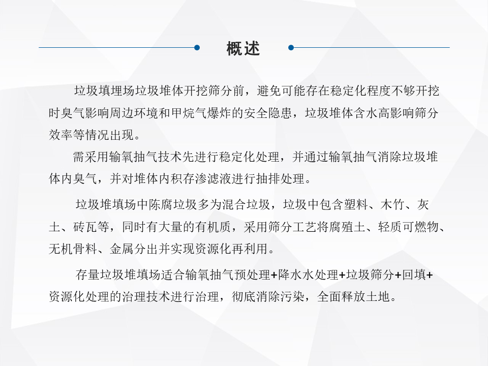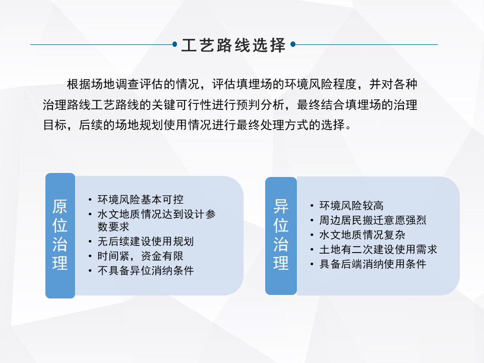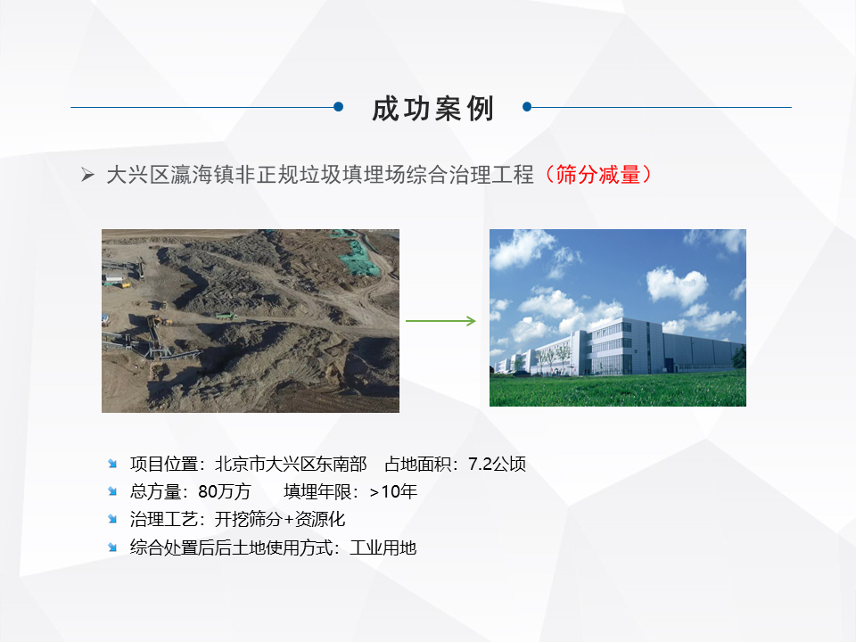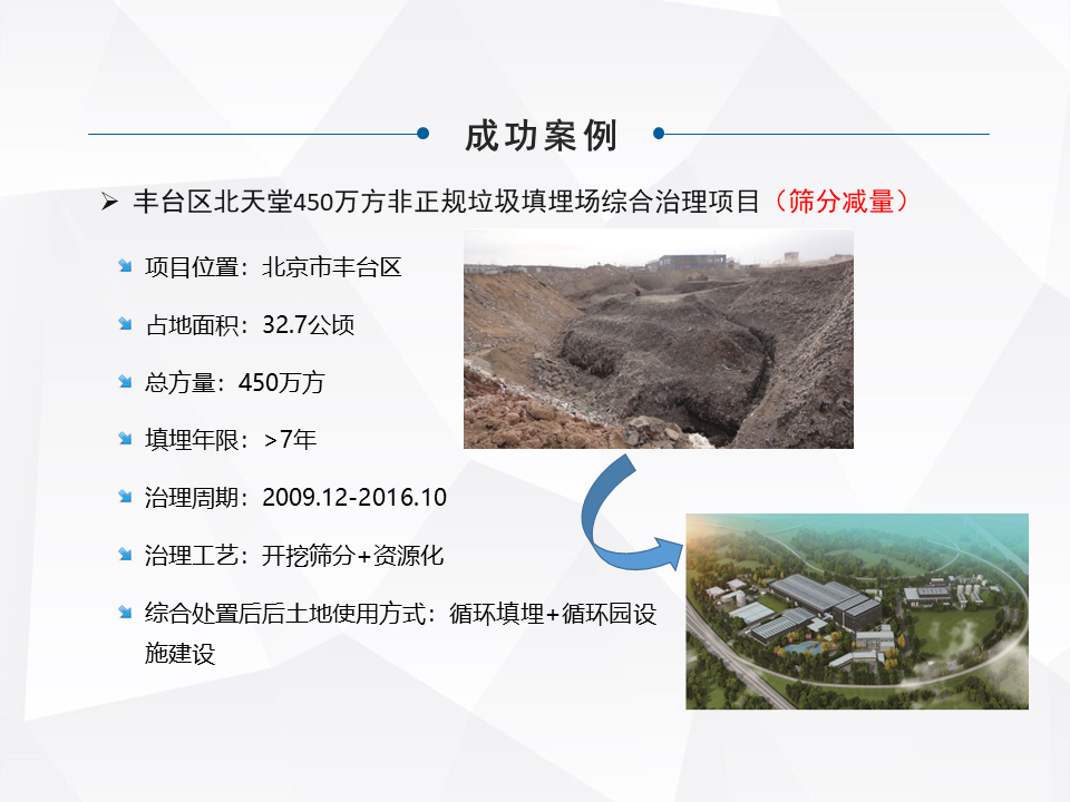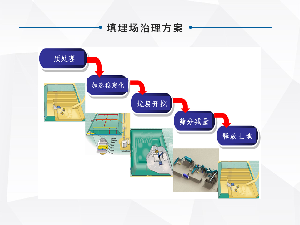 另外一種就是做一個(gè)異位的治理,這是一些小規(guī)模的,城市規(guī)劃了大型的填埋場,對一些小型的就做整體的搬遷。特別前幾年的時(shí)候,像河北很多地區(qū)整體的做坑塘垃圾的收集,就是把一些小散亂的,集中的匯到一個(gè)地方。還有一塊就是做綜合的處理,我們最早因?yàn)楣疽彩亲龇诌x技術(shù)出來的,最早我們主流是做綜合處理這塊比較多一些。