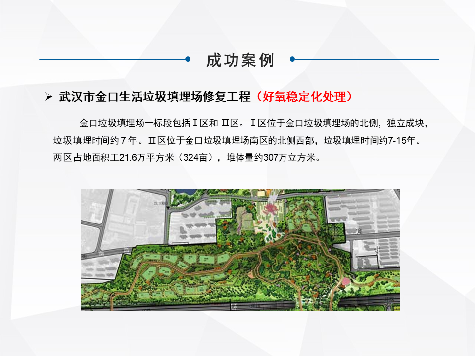 武漢的金口做了加速穩(wěn)定化,滲濾液的集中處理以后,當(dāng)時(shí)是做成了武漢那一屆園博園的項(xiàng)目。這個(gè)是武漢北洋橋,是簡易填埋場的生態(tài)修復(fù),這個(gè)項(xiàng)目最早12年我們?nèi)サ臅r(shí)候,它離武漢高鐵站特別近,周圍樓盤比較多,環(huán)境敏感度比較高。最早政府是要把它徹底清理的,最早想整體開挖和綜合處理,后來沒有采用,有幾個(gè)必要的條件,當(dāng)時(shí)它的體量將近四百多萬方,治理的周圍不能特別長。短期之內(nèi)真的是開發(fā)出來,分選完了哪些物料,在短時(shí)間內(nèi)怎么有效的再利用和實(shí)現(xiàn)減量消納,是很難實(shí)施的。最后他先采用了原位修復(fù)的方式,先讓整體的環(huán)境得到了一個(gè)比較大程度的改善。
