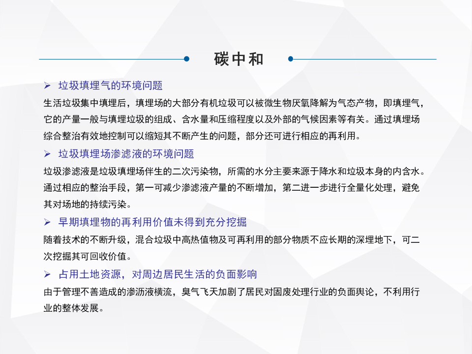 說到老舊填埋場的治理,前期的時(shí)候從剛才提到的,從“十二五”、“十三五”,最早是北京做,然后延伸到部里推廣全國去做,最開始主要是因?yàn)橛行┰缙诘奶盥駡鎏盥癫灰?guī)范,主要還是著眼于它對環(huán)境的負(fù)面影響,能及時(shí)消除污染。但是從去年開始,隨著國家固廢處理產(chǎn)業(yè)結(jié)構(gòu)的調(diào)整,垃圾填埋在整個(gè)固廢處理里面的定位也在不斷的變化。未來雖然是以焚燒為主,但是每個(gè)城市還是要有填埋場的,是要作為一個(gè)應(yīng)急處理的設(shè)施。甚至未來的定位跟現(xiàn)在在收運(yùn)環(huán)節(jié)的垃圾中轉(zhuǎn)站一樣,在空間和時(shí)間上給整個(gè)城市的垃圾處置,在協(xié)調(diào)過程中能提供一個(gè)時(shí)間和空間的中轉(zhuǎn)。