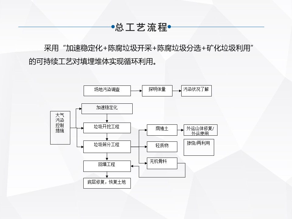 主要實(shí)現(xiàn)的目標(biāo)是兩塊,一塊是從環(huán)境污染控制這一塊來說,另外一塊從占用大量的土地和庫容這塊來說。選擇工藝之前,比較重要的還是要前期做好調(diào)查和評估。像我們當(dāng)時(shí)北京也是由宗正所在的科研所對全北京市的已有的已知的非正規(guī)的填埋場進(jìn)行了整體的調(diào)查,調(diào)查完了以后,根據(jù)所有填埋場的庫容,它所在的位置,周圍跟底細(xì)水地表水的污染狀況,來進(jìn)行評級。根據(jù)評級的情況來選擇不同的治理工藝,然后再進(jìn)行分批實(shí)施。