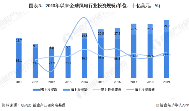 風(fēng)能發(fā)電是目前可再生能源中技術(shù)最成熟、最具有規(guī)?;_發(fā)條件和商業(yè)化發(fā)展前景的發(fā)電方式之一。數(shù)據(jù)顯示,2010年以來(lái),全球風(fēng)能投資總體增長(zhǎng),但增速趨緩,2019年,全球風(fēng)能投資總額達(dá)1427億美元,2010-2019年間的風(fēng)能投資復(fù)合增速為3.85%。在風(fēng)電產(chǎn)建設(shè)方面,海上風(fēng)電場(chǎng)建設(shè)加速、新增裝機(jī)容量不斷提高。