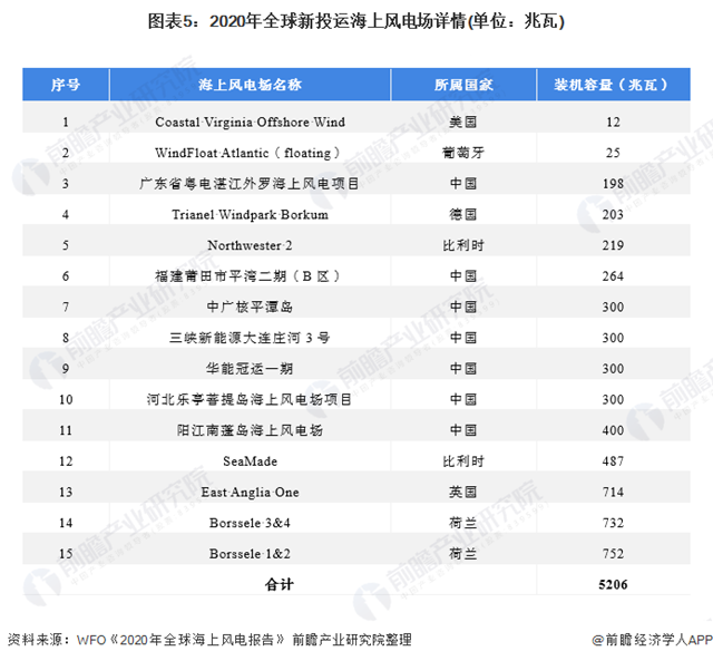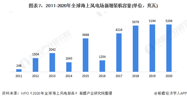 海上風(fēng)電場(chǎng)方面,2011年以來(lái),全球海上風(fēng)電場(chǎng)建設(shè)加速,裝機(jī)容量保持穩(wěn)定增長(zhǎng);2018-2020年之間,全球海上風(fēng)電場(chǎng)每年的新增裝機(jī)容量都保持在5000兆瓦以上;2020年,全球海上風(fēng)電場(chǎng)新增裝機(jī)容量5206兆瓦。