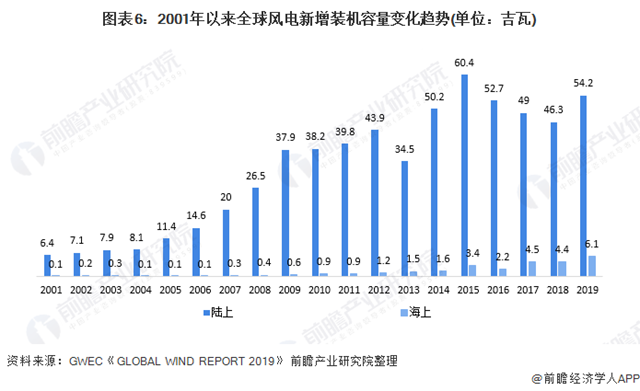 2020年,海上風(fēng)電場(chǎng)累計(jì)裝機(jī)容量占全球海上風(fēng)電總裝機(jī)容量的比重達(dá)92.4%,從全球風(fēng)電總裝機(jī)容量來(lái)看,2001年以來(lái),全球新增風(fēng)電裝機(jī)容量總體增長(zhǎng),2010年以后,陸上新增裝機(jī)容量波動(dòng)增長(zhǎng),而海上風(fēng)電新增裝機(jī)容量保持平穩(wěn)增長(zhǎng)。2019年,全球新增風(fēng)電裝機(jī)容量合計(jì)達(dá)60.4吉瓦,其中陸上新增容量54.2吉瓦,海上新增容量6.1吉瓦。