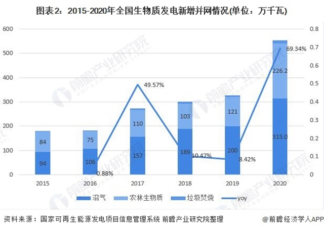 新增垃圾焚燒發(fā)電并網(wǎng)容量占比過半。根據(jù)國家可再生能源發(fā)電項目信息管理系統(tǒng)監(jiān)測數(shù)據(jù)顯示,2020年,全國生物質(zhì)發(fā)電新增并網(wǎng)容量553.6萬千瓦,同比增長接近70%。其中,垃圾焚燒發(fā)電315.0萬千瓦,農(nóng)林生物質(zhì)發(fā)電226.2 萬千瓦,沼氣發(fā)電12.5萬千瓦。