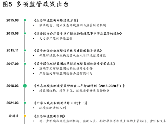 此外,政府對第三方服務(wù)企業(yè)也將嚴(yán)加監(jiān)管,避免數(shù)據(jù)造假、運(yùn)維不規(guī)范等問題。2015年至今,環(huán)境監(jiān)測質(zhì)量監(jiān)管政策持續(xù)出臺(tái)(如圖5),尤其是在剛通過不久的刑法修正案中,環(huán)境監(jiān)測造假入刑,懲治力度大幅提升。2018年展開的三年行動(dòng)“打假”也卓有成效,大量違規(guī)機(jī)構(gòu)遭到清退。在國家層面,生態(tài)環(huán)境部聯(lián)合市場監(jiān)管總局對37家國家級資質(zhì)認(rèn)定生態(tài)環(huán)境監(jiān)測機(jī)構(gòu)開展了“雙隨機(jī)”監(jiān)督檢查,其中有3家被注銷資質(zhì)認(rèn)定證書,1家因出具失實(shí)報(bào)告被責(zé)令整改并處以罰款,18家因存在未嚴(yán)格執(zhí)行標(biāo)準(zhǔn)規(guī)范等問題,被責(zé)令限期整改。在地方層面,以河北省為例,對282家生態(tài)環(huán)境監(jiān)測機(jī)構(gòu)進(jìn)行專項(xiàng)監(jiān)督檢查,最終暫停、縮減114家機(jī)構(gòu)的監(jiān)測資質(zhì)及監(jiān)測項(xiàng)。