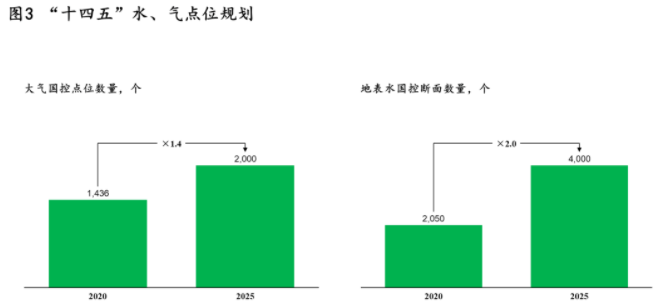 環(huán)境監(jiān)測密度將從時(shí)間、空間兩個(gè)維度上增大。在時(shí)間上,監(jiān)測頻次將進(jìn)一步增加,并能夠做出動(dòng)態(tài)調(diào)整。我國監(jiān)測網(wǎng)絡(luò)目前已普遍覆蓋大氣、水、海洋、土壤、聲、輻射、生態(tài)等各類環(huán)境要素,點(diǎn)多面廣但監(jiān)測頻次較低,未來五年常規(guī)監(jiān)測將向高頻次發(fā)展,增加空中遙感監(jiān)測、無人船監(jiān)測等自動(dòng)監(jiān)測手段的覆蓋面,提高監(jiān)測數(shù)據(jù)的時(shí)間分辨率,并逐步實(shí)現(xiàn)根據(jù)環(huán)境質(zhì)量達(dá)標(biāo)情況動(dòng)態(tài)調(diào)整。在空間上,水、氣站點(diǎn)將大幅增加(如圖3),空氣監(jiān)測站點(diǎn)將填平補(bǔ)齊城市空缺,地表水將實(shí)現(xiàn)十大流域干流及重要支流、地級及以上城市、重要水體省市界和重要水功能區(qū)“四個(gè)全覆蓋”。