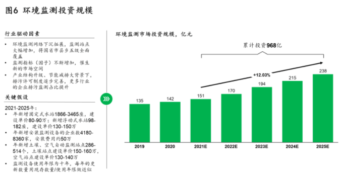 伴隨需求升級,我們預(yù)計(jì)“十四五”期間,環(huán)境監(jiān)測將迎來968億元的累計(jì)投資(如圖6),同期環(huán)境監(jiān)測運(yùn)營規(guī)模將保持11%的年復(fù)合增速,在2025年達(dá)到165億。