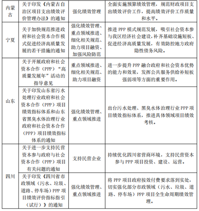 地方層面,同樣在加強(qiáng)績效管理、支持民營企業(yè)、示范案例推廣、細(xì)化相關(guān)規(guī)范、推動項目融資、重點(diǎn)領(lǐng)域推進(jìn)、規(guī)范第三方服務(wù)等方面推動PPP模式在各省市的應(yīng)用及推廣。北京、江蘇等省市發(fā)布PPP項目績效管理相關(guān)通知規(guī)范PPP項目全生命周期績效管理,提高公共服務(wù)供給效能,保障合作各方合法權(quán)益,進(jìn)一步提升PPP項目管理水平。四川發(fā)布文件支持民營資本參與PPP項目投資、建設(shè)、運(yùn)營。江蘇發(fā)布文件組織申報2020年度省級PPP示范項目,推進(jìn)PPP工作高質(zhì)量發(fā)展,加強(qiáng)示范引領(lǐng)和樣板推廣,帶動更多生態(tài)環(huán)保等綠色PPP項目落地實(shí)施。寧夏、山東等省市發(fā)布文件細(xì)化相關(guān)規(guī)定、優(yōu)化審批流程與項目實(shí)施,加強(qiáng)項目庫管理制度等制度建設(shè)。北京、廣西等省市發(fā)布文件通過發(fā)行債券、資產(chǎn)證券化、REITs等方式助力PPP項目融資及再融資業(yè)務(wù)。河北、四川等省市發(fā)布文件,在污水處理、垃圾處理、綠色社區(qū)改造等綠色領(lǐng)域推廣運(yùn)用PPP模式。