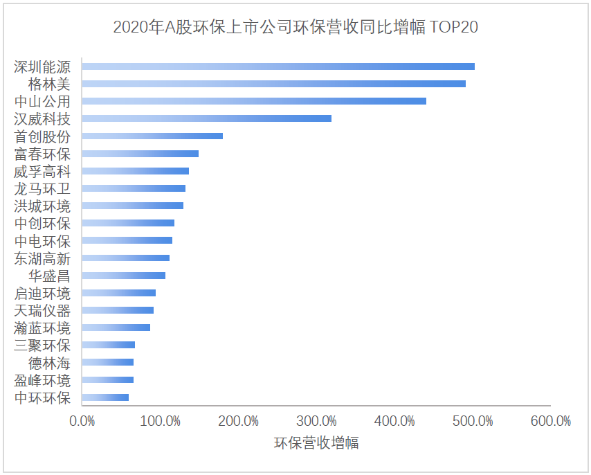 A股環(huán)保上市公司環(huán)保營收方面:2020年,150家上市公司環(huán)保營收總額3341.4億元,同比增長25.3%。其中,101家(占比67.3%)環(huán)保營收實現(xiàn)同比增長,最高增幅約達1171.1%;49家(占比32.7%)同比下滑,最高跌幅約達-89.8%。環(huán)保營收規(guī)模居首位的中國天楹,得益于重大并購后境內(nèi)業(yè)務(wù)和境外業(yè)務(wù)的雙雙增長;首創(chuàng)股份污水處理、供水服務(wù)、固廢處理業(yè)務(wù)營收增長均超過30%,環(huán)保營收規(guī)模進一步擴大。營收增幅排名靠前的企業(yè)中,深圳能源營收總額與上年基本持平,環(huán)保板塊營收增速明顯且毛利率提升,在其他主營業(yè)務(wù)受到?jīng)_擊的情況下,環(huán)保業(yè)務(wù)成為企業(yè)重要新的增長極。(注:因港股環(huán)保上市公司環(huán)保營收難以準(zhǔn)確從總營收中拆分,未計入統(tǒng)計。)2020年A股環(huán)保上市公司環(huán)保營收TOP20