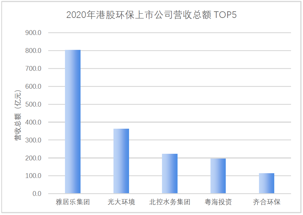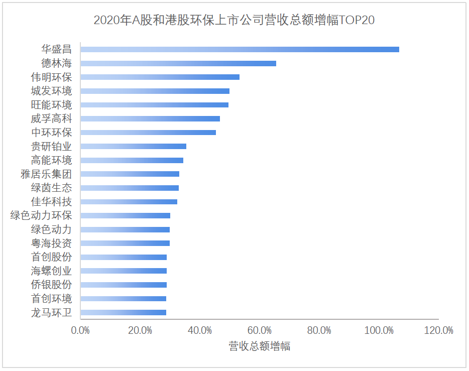 注: 數(shù)據(jù)來源于Wind數(shù)據(jù)庫,個別A股環(huán)保上市公司的環(huán)保營收難以準(zhǔn)確確定,實際情況以上市公司發(fā)布為準(zhǔn)。A股和港股環(huán)保上市公司營收總額方面:2020年179家環(huán)保上市公司共實現(xiàn)營收總額10717.4億元,同比增長7.6%,營收總額規(guī)模呈現(xiàn)擴張態(tài)勢。其中,120家營收(占比67.0%)實現(xiàn)同比增長,最高增幅106.8%,59家(占比33.0%)營收同比下滑,最高跌幅-89.8%。其中,增幅最高的華盛昌,主要得益于防疫相關(guān)檢測設(shè)備銷售的增長;緊隨其后的德林海營收的快速增長主要得益于藍藻治理業(yè)務(wù)的增長;偉明環(huán)??偁I收整體增幅也超過50%,其垃圾焚燒設(shè)備、EPC及服務(wù)業(yè)務(wù)營收增長193.02%,垃圾清運業(yè)務(wù)營收增長超過90%。