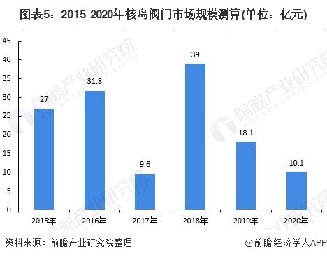 閥門設(shè)備則一般在運(yùn)行3年后出現(xiàn)備件更換等,考慮到時(shí)間滯后性和每年關(guān)停的核電機(jī)組數(shù)量,假設(shè)每年可運(yùn)行核電機(jī)組中有90%需要維修,按照每臺(tái)百萬千萬級(jí)核電機(jī)組的閥門維修、更換費(fèi)用每年約3375萬元,結(jié)合中國核電機(jī)組可運(yùn)行數(shù)量測(cè)算,2020年,中國核電閥門更新市場(chǎng)規(guī)模為14.9億元。核電閥門總市場(chǎng)規(guī)模為37.5億元。