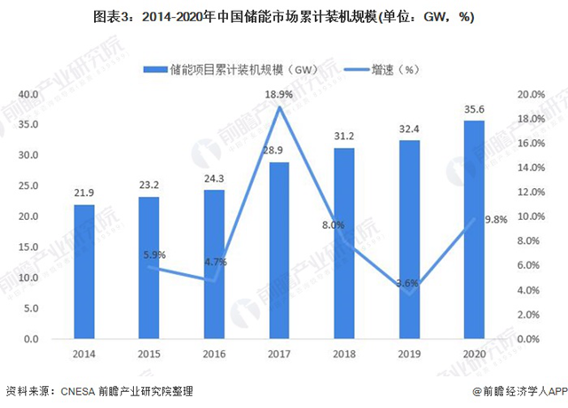 由于儲能在清潔利用方面的重要作用,近年來,我國儲能項目裝機規(guī)模穩(wěn)步增長。根據(jù)中關村儲能產業(yè)技術聯(lián)盟(CNESA)統(tǒng)計,截至2020年底,我國已投運儲能項目累計裝機規(guī)模為35.6GW,占全球市場總規(guī)模的18.6%,同比增長9.8%。