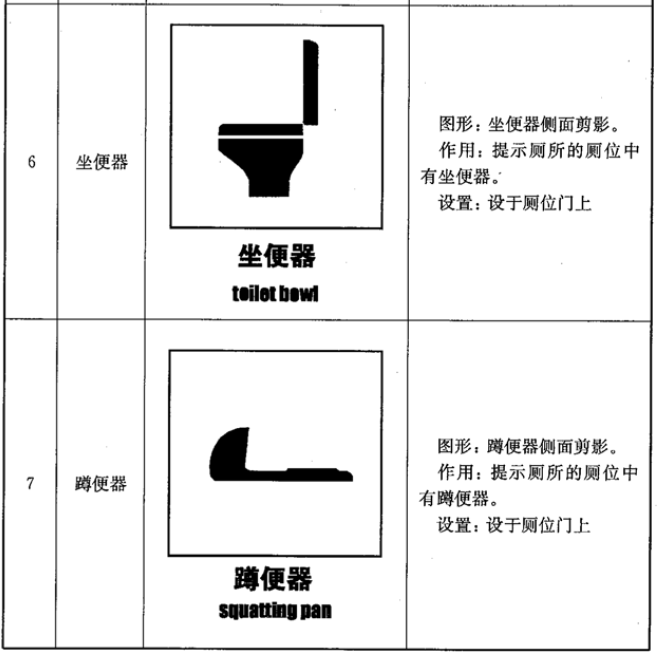 按照標(biāo)準(zhǔn)CJJ/T 125-2008《環(huán)境衛(wèi)生圖形符號(hào)標(biāo)準(zhǔn)》,公廁相關(guān)的主要圖形如上圖所示。