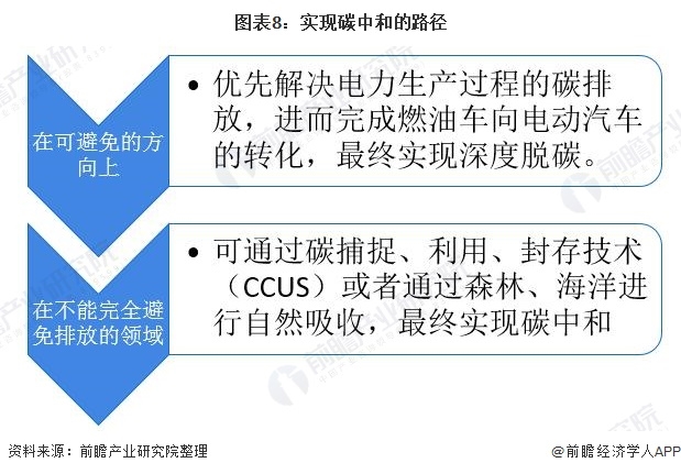 在可避免的方向上,國(guó)家提出優(yōu)先解決電力生產(chǎn)過(guò)程的碳排放,進(jìn)而完成燃油車(chē)向電動(dòng)汽車(chē)的轉(zhuǎn)化,最終實(shí)現(xiàn)深度脫碳。在不能完全避免排放的領(lǐng)域,可通過(guò)碳捕捉、利用、封存技術(shù)(CCUS)或者通過(guò)森林、海洋進(jìn)行自然吸收,最終實(shí)現(xiàn)碳中和。