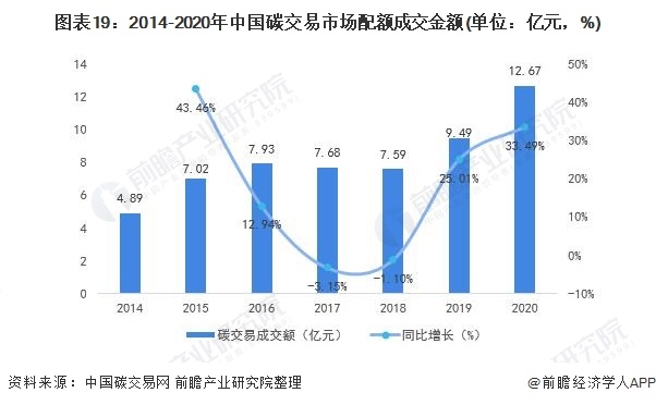 從我國(guó)碳交易市場(chǎng)的成交金額變化情況來(lái)看,2014-2020年我國(guó)碳交易市場(chǎng)成交額整體呈現(xiàn)增長(zhǎng)趨勢(shì),僅在2017、2018兩年有小幅度減少。2020年我國(guó)碳交易市場(chǎng)成交額達(dá)到了12.67億元人民幣,同比增長(zhǎng)了33.49%,創(chuàng)下碳交易市場(chǎng)成交額新高。