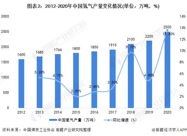 中國(guó)為全球第一產(chǎn)氫大國(guó),年產(chǎn)氫氣上千萬噸。2012-2020年,中國(guó)氫氣產(chǎn)量整體呈穩(wěn)步增長(zhǎng)趨勢(shì)。2020年,中國(guó)氫氣產(chǎn)量超過2500萬噸,同比增長(zhǎng)13.6%。