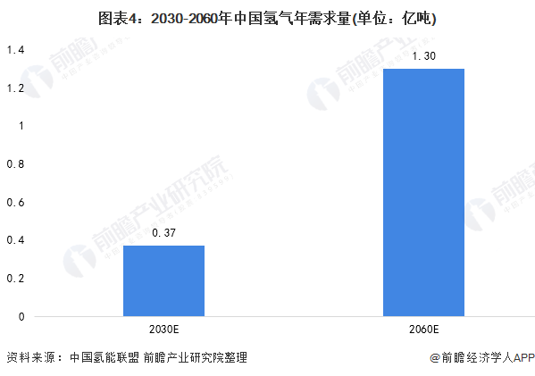 2021年4月21日,中國(guó)氫能聯(lián)盟發(fā)布《中國(guó)氫能源及燃料電池產(chǎn)業(yè)白皮書2020》,指出在2030年碳達(dá)峰情景下,我國(guó)氫氣的年需求量將達(dá)到3715萬噸,在終端能源消費(fèi)中占比約為5%;在2060年碳中和情景下,我國(guó)氫氣的年需求量將增至1.3億噸左右,在終端能源消費(fèi)中占比約為20%。