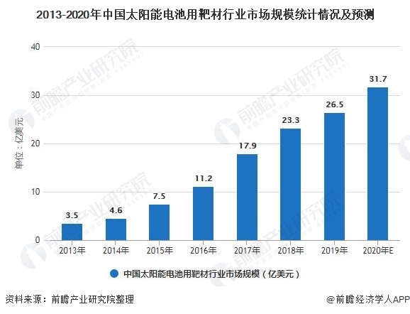 目前國內(nèi)太陽能電池主要以硅片涂覆型太陽能電池為主,薄膜電池的產(chǎn)量仍較小,而且以硅薄膜電池為主,因此濺射靶材市場規(guī)模較小,據(jù)江豐電子招股說明書顯示,2018年度,我國太陽能電池用靶材市場規(guī)模約為23.3億元,結(jié)合近幾年光伏行業(yè)發(fā)展情況(光伏裝機(jī)量)測算,2020年,我國太陽能電池用靶材市場規(guī)模達(dá)31.7億元。