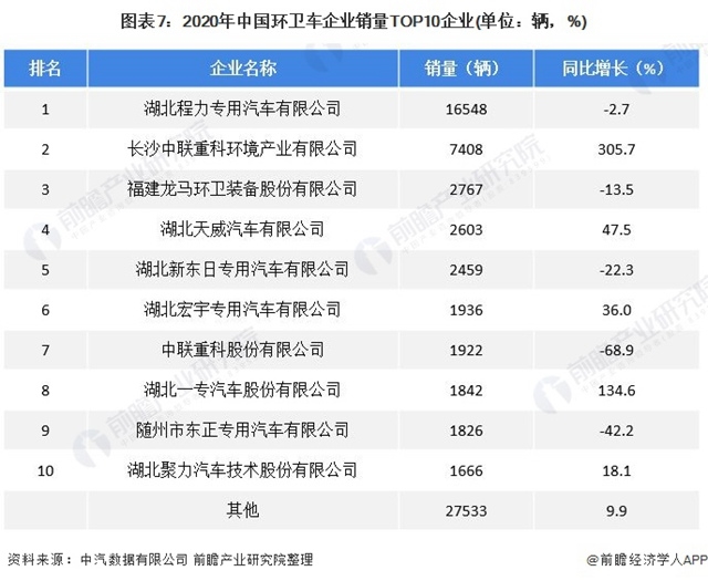 2020年市政環(huán)衛(wèi)車銷量TOP10企業(yè)市場集中度為59.8%,與2019年相比下滑了4.9個百分點,企業(yè)集中度有所下滑。