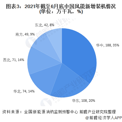 2021年1-6月,華中地區(qū)和華東地區(qū)的新增裝機(jī)容量較多,分別達(dá)到188萬(wàn)千瓦和108萬(wàn)千瓦。截止2021年6月底,華北地區(qū)和西北地區(qū)的風(fēng)能累計(jì)裝機(jī)容量占比超過(guò)全國(guó)一半,分別達(dá)到28%和24%。