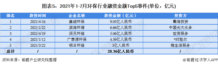 2021年1-7月,環(huán)保行業(yè)Top5投融資事件共計(jì)28.36億元,其中獲投金額最多的主人翁為嘉誠(chéng)環(huán)保,由粵海投資9.05億元。